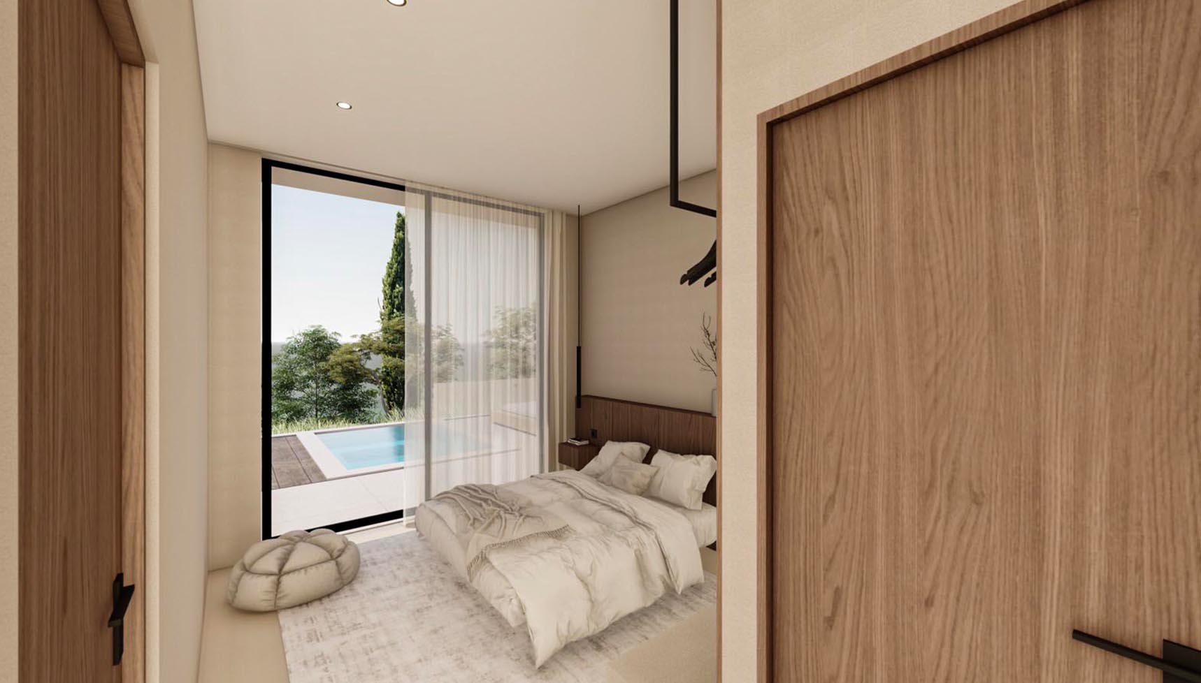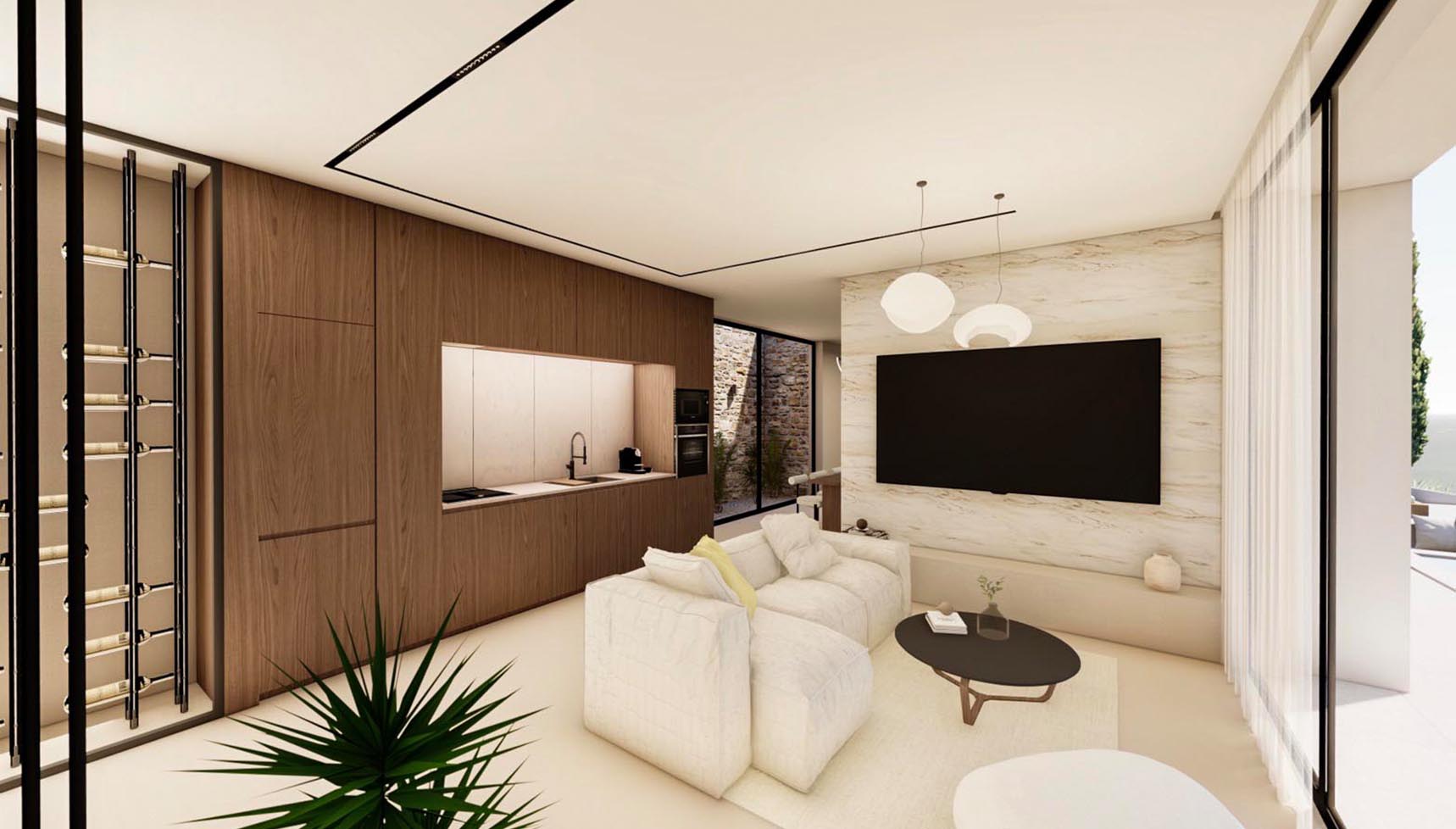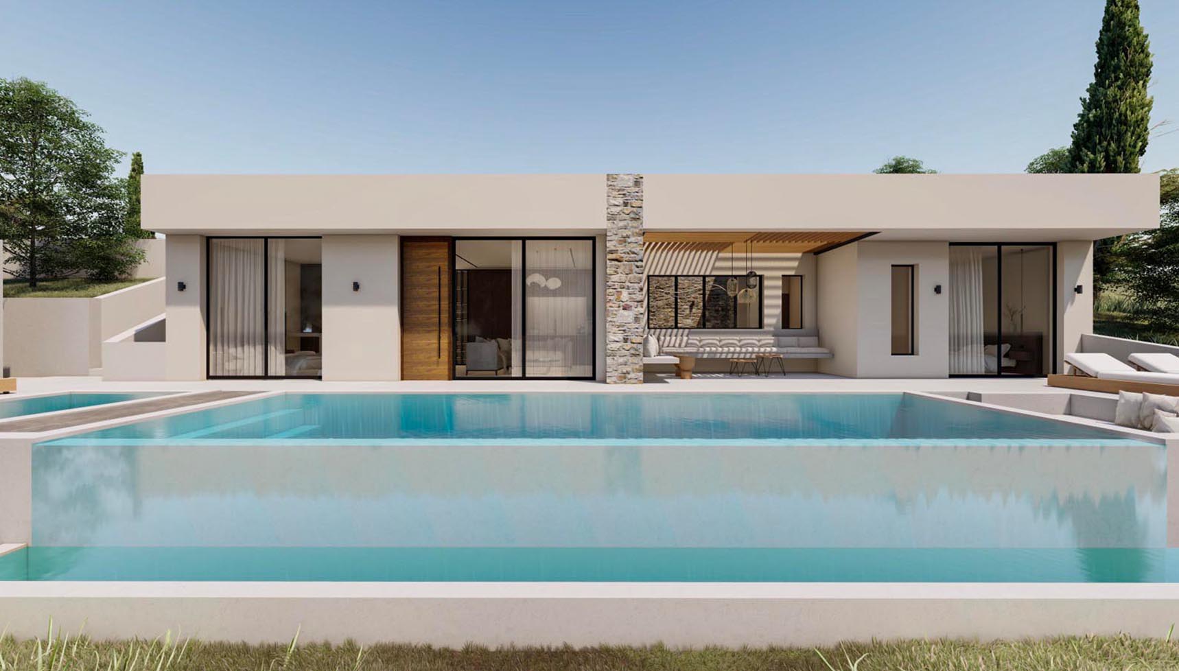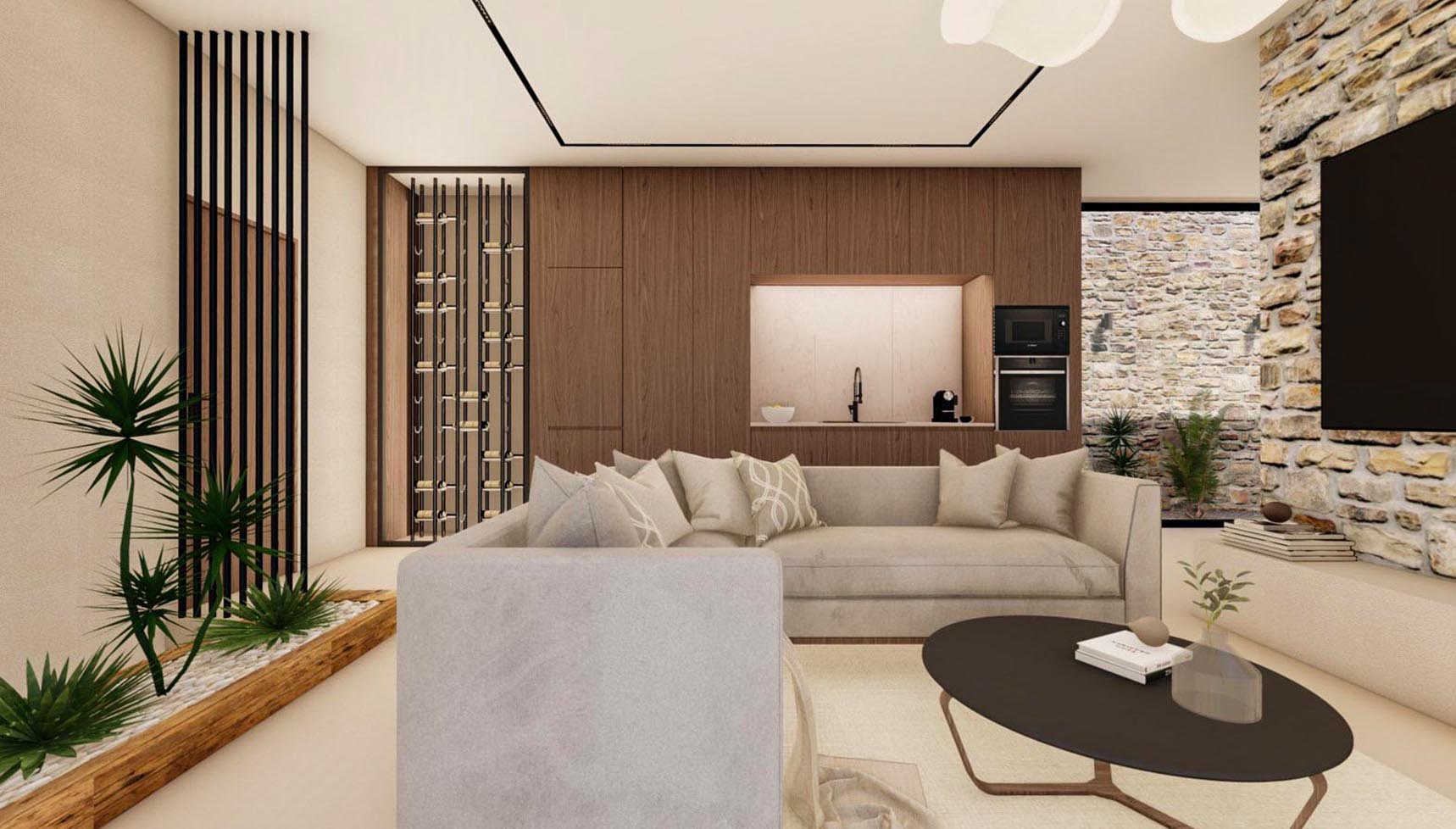 It is the lower part of a 2-villas complex with a total area of 173,40 square meters and it features three spacious bedrooms, each with an en-suite bathroom and three additional WCs, as well as walk-in closets and a high-quality integrated cooling system for absolute comfort.