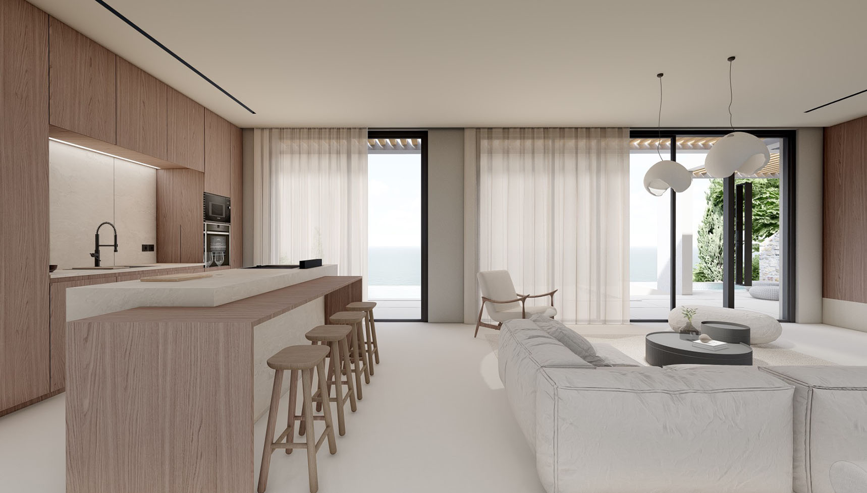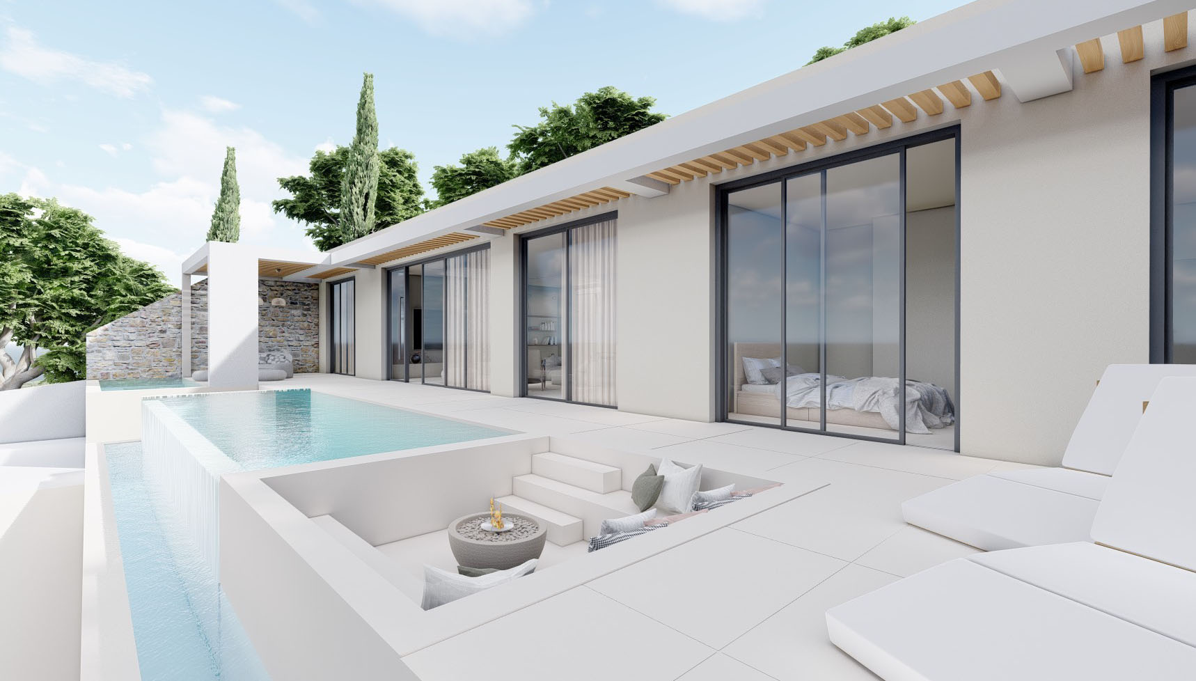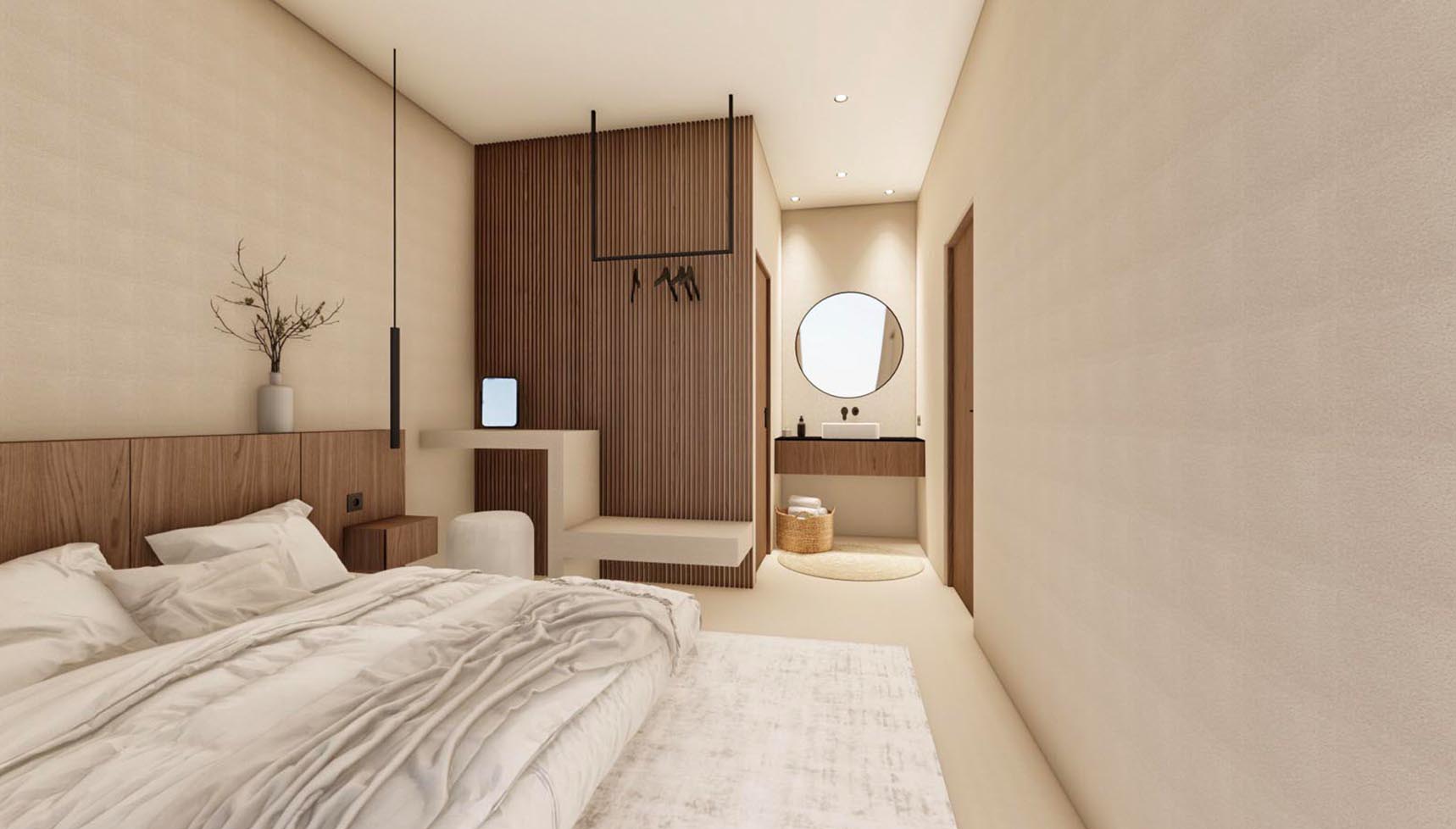 It is the lower part of a 2-villas complex with a total area of 173,40 square meters and it features three spacious bedrooms, each with an en-suite bathroom and three additional WCs, as well as walk-in closets and a high-quality integrated cooling system for absolute comfort.