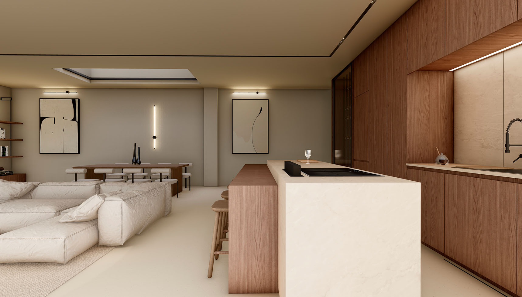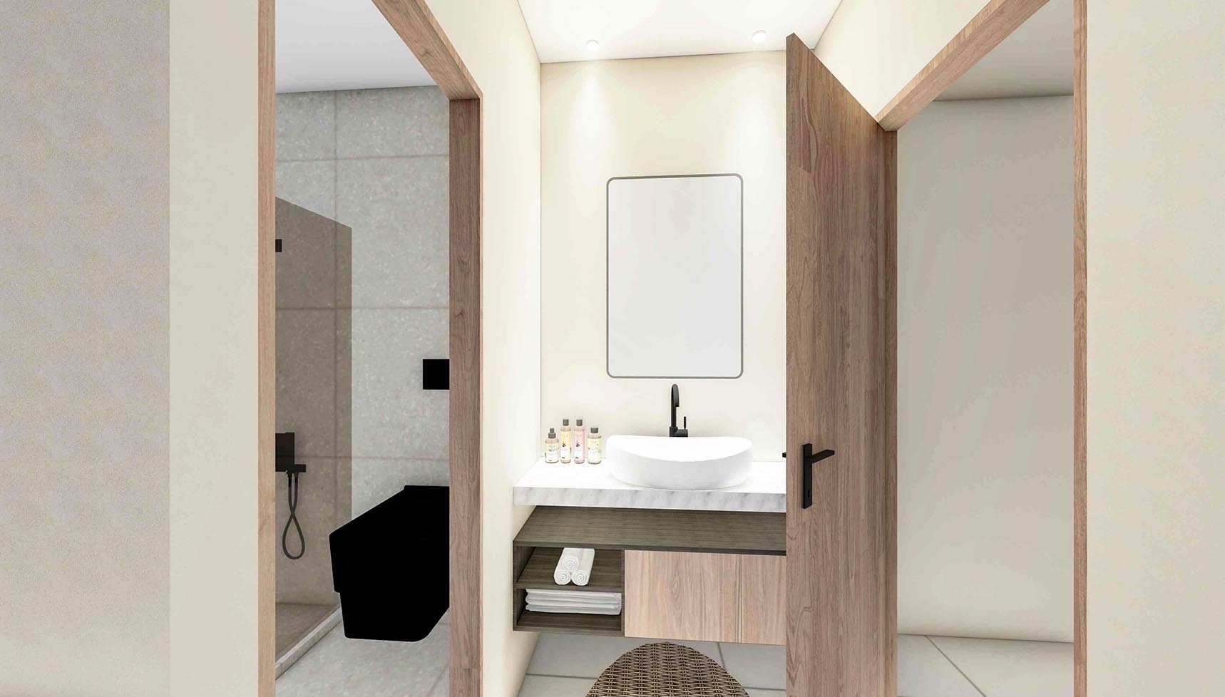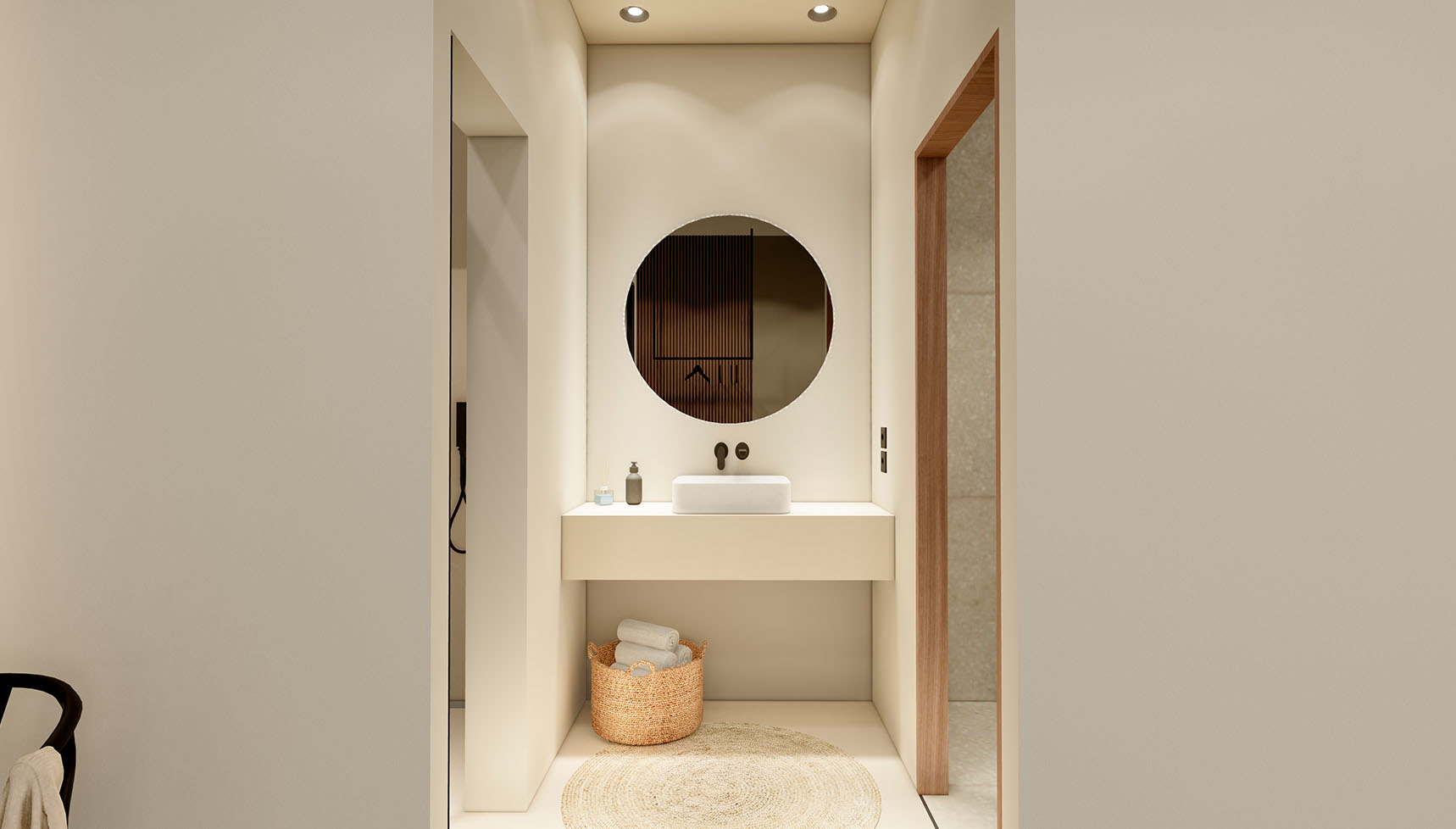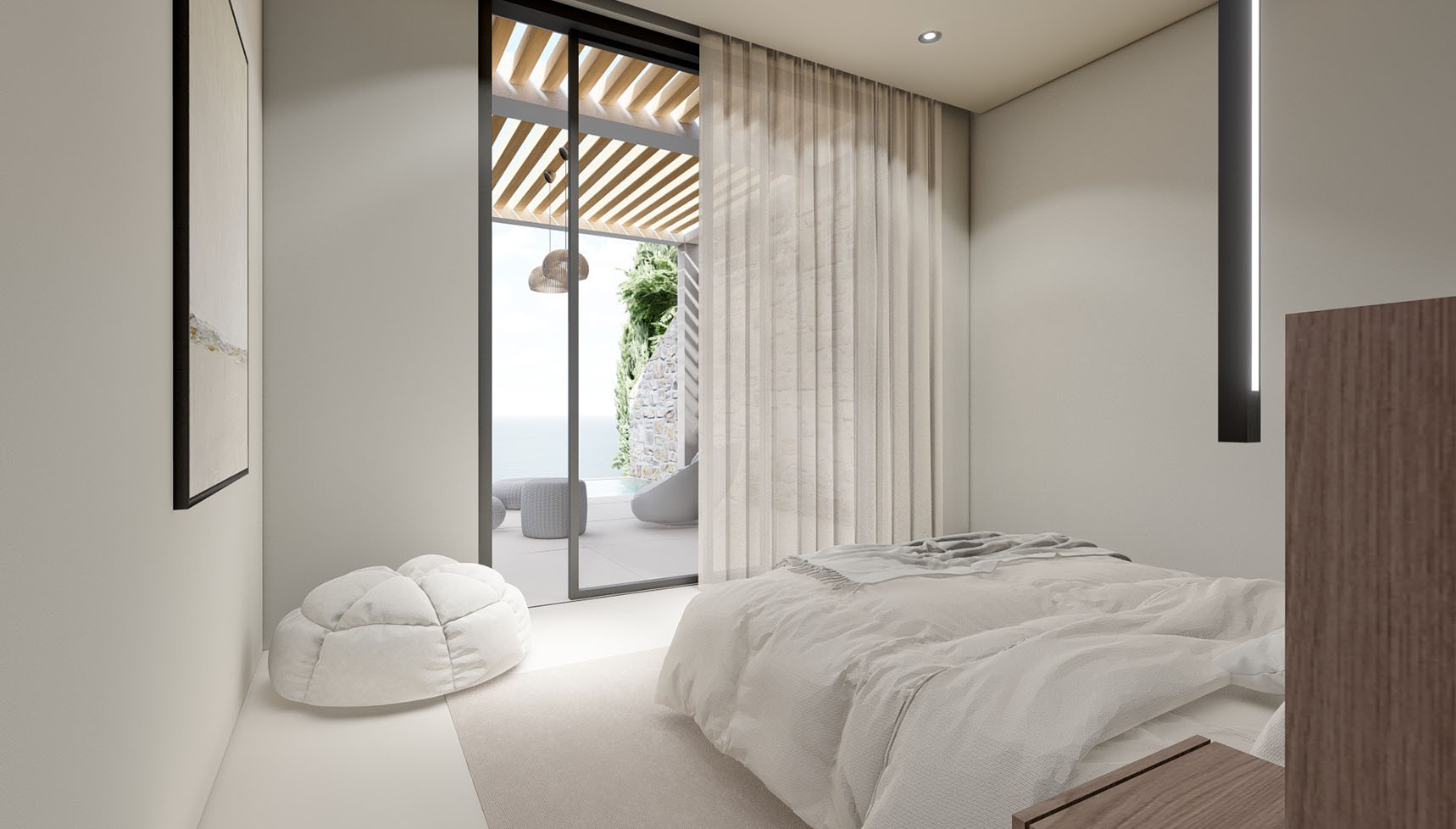 It is the lower part of a 2-villas complex with a total area of 173,40 square meters and it features three spacious bedrooms, each with an en-suite bathroom and three additional WCs, as well as walk-in closets and a high-quality integrated cooling system for absolute comfort.